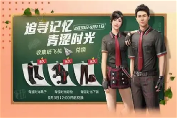青涩时光首先是需要玩家利用纸飞机来兑换的,为了迎接开学季游戏,已经开通了套装兑换活动,参与活动之后就可以免费获得永久的皮肤套装,下面会提到具体的兑换标准以及获取方式: